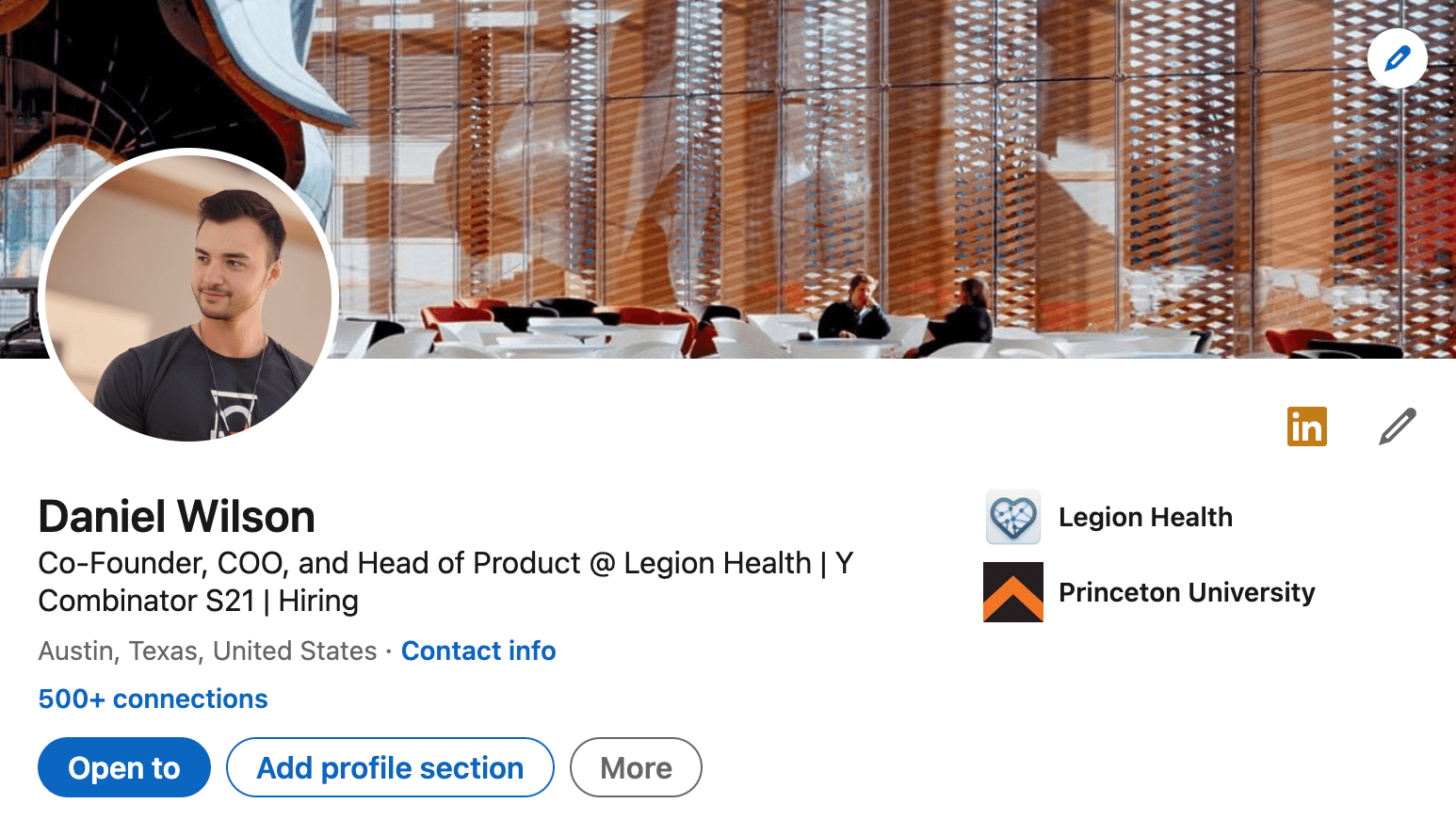 I am the co-founder and CTO of Legion Health, a Y Combinator-backed startup that is… · Experience: Legion Health · Education: Princeton University · Location: Austin · 500+ connections on LinkedIn. View Daniel Wilson’s profile on LinkedIn, a professional community of 1 billion members.